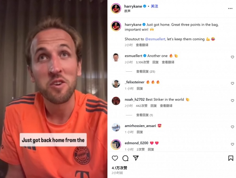 9月21日讯 拜仁在本轮德甲焦点战4-1轻取霍芬海姆,凯恩上演帽子戏法。他也在赛后通过社媒庆祝胜利,并配文:“刚刚回家。精彩三分入袋,一...